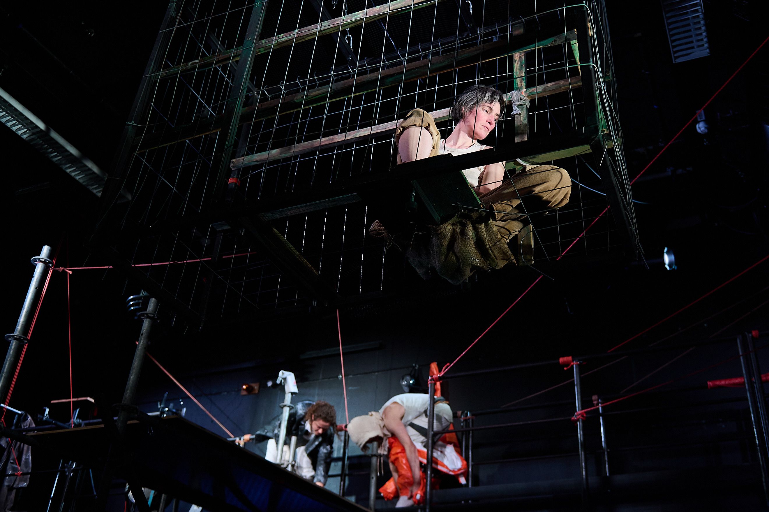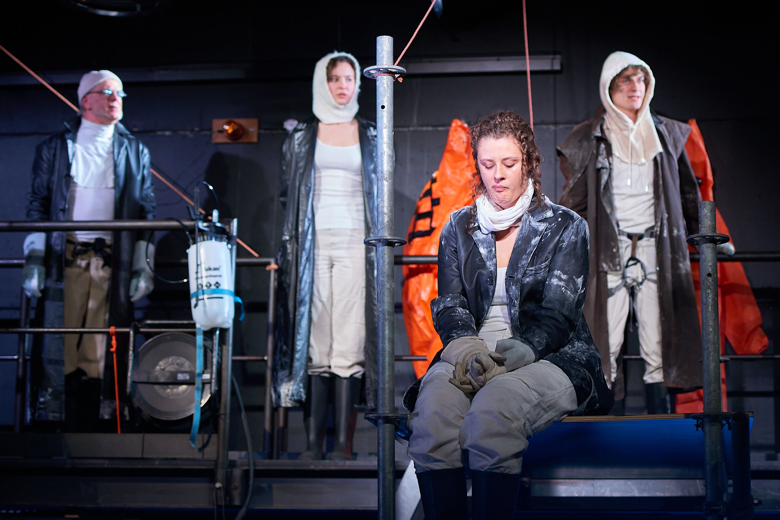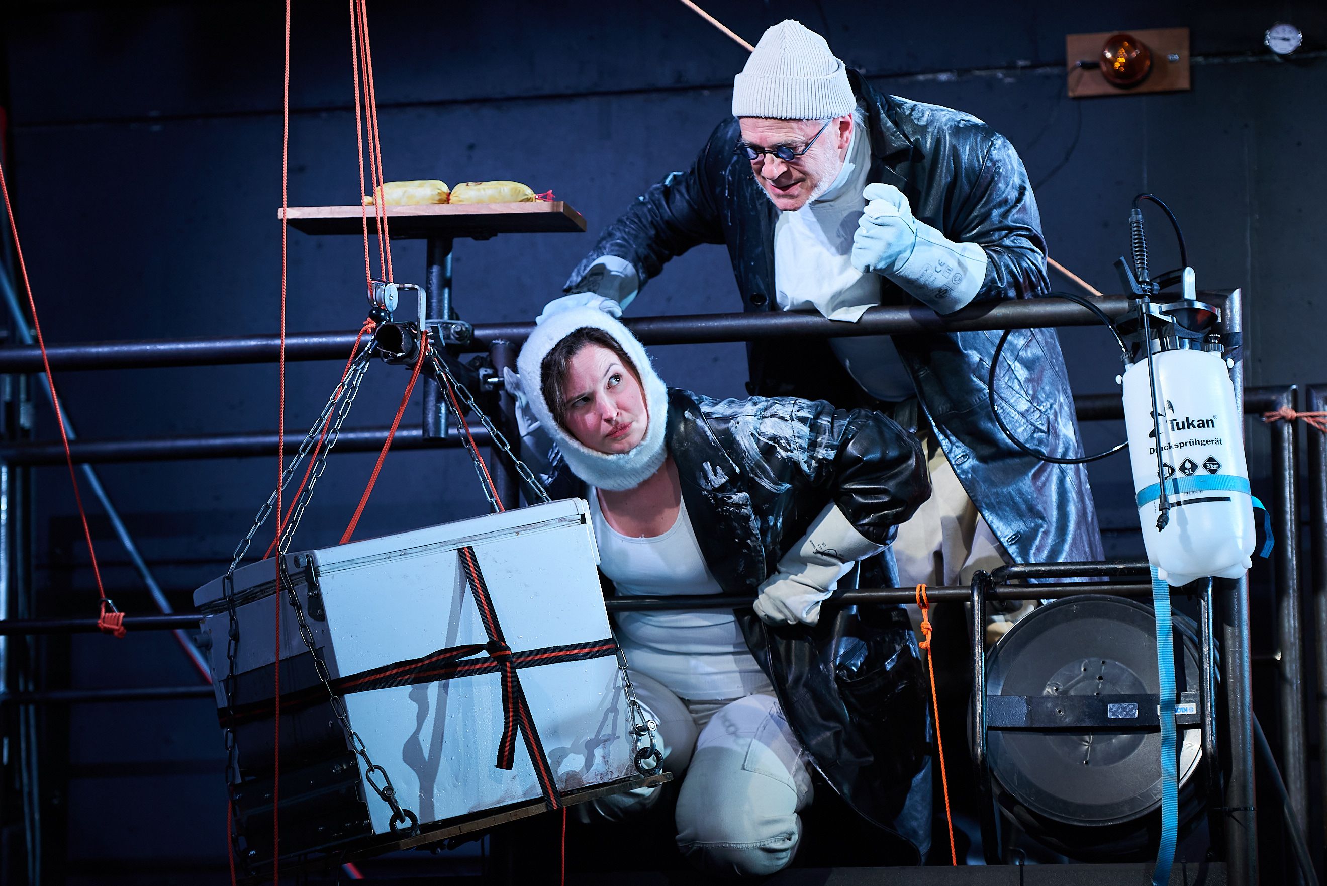 Die Welt ist untergegangen. Im wahrsten Sinne des Wortes. Nach einem drastischen Anstieg des Meeresspiegels leben die Menschen in Heinrich Bölls Bühnendebüt EIN SCHLUCK ERDE auf den kargen Überresten unserer Zivilisation. Nahrung ist knapp und ein Schluck Erde eine Kostbarkeit. Auf kleinen verbliebenen Stückchen Erde haben sich die selbsternannten „Wisser“ ein totalitäres System aufgebaut und wachen „wissend“ über die Einhaltung eines vernünftigen, achtsamen und sparsamen Lebenswandels. Den vernünftigen Lust-feindlichen „Wissern“ gegenüber leben die sogenannten „Kresten“, die im Gegensatz zu den herrschenden Technokraten  und zu deren Missfallen sich die Fähigkeit bewahrt haben, widersprüchlich, sinnlich und unvernünftig zu sein. Und trotz Sanktionen und Strafen bleiben Genuss, Gewissen und Erinnerung, diese letzten Reste von Menschlichkeit, eine Gefahr für das System. Denn nur die Demokratie ist in der Lage ihre Feinde auszuhalten, alle anderen Systeme müssen sie ausmerzen.